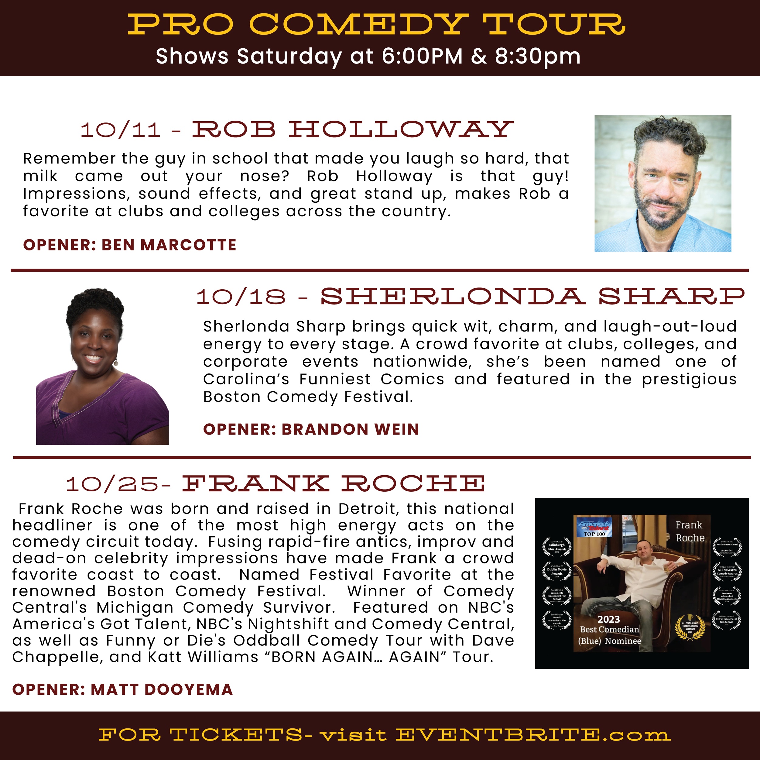 The top 200 touring comedians in the United States, featured regularly on and writing for Jimmy Fallon, Jimmy Kimmel, HBO, Saturday Night Live, Last Comic Standing and more. Dinner available before and during the show. Make reservations, shows do sell out.